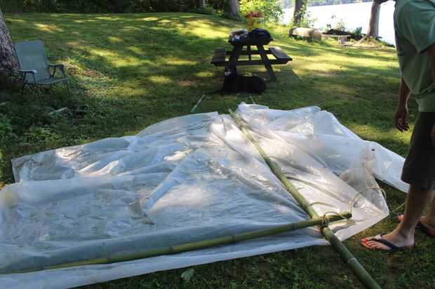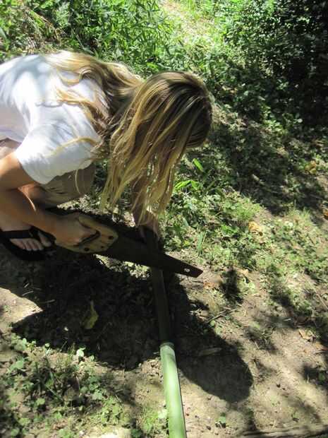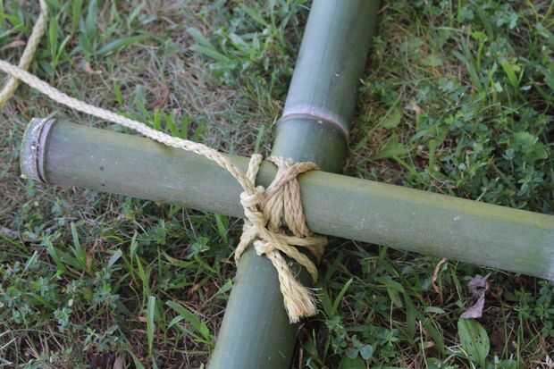 Para construir el mástil de la embarcación se utilizó bambú que crecía cerca de nuestra casa. Si no tienes acceso a bambú y quiere usar algo más para construir el mástil con tacos de madera o barras de cortinas funcionaría bien. Dependiendo del tamaño del barco y la velocidad del viento, corta la barra con el tamaño apropiado (cortamos nuestra a 12 pies). Luego corte el otra barra que quepa horizontalmente en el mástil (nuestra era unos 8 pies). (Ver imagen 3) Asegúrese de que la varilla pasa por el mástil un poco. Unir las dos varillas firmemente con la cuerda. (Asegúrese de que hay cerca de 1 pie de cuerda colgando hacia fuera a la izquierda)