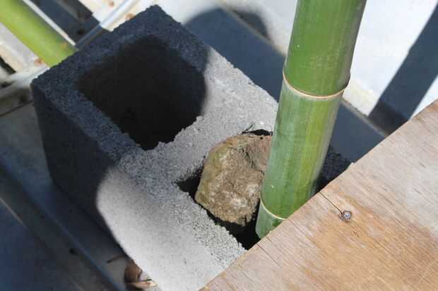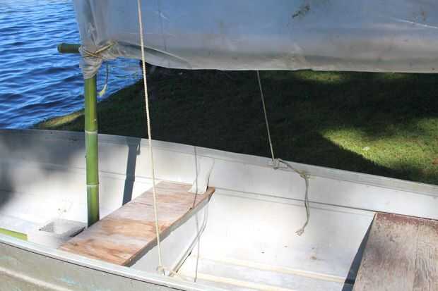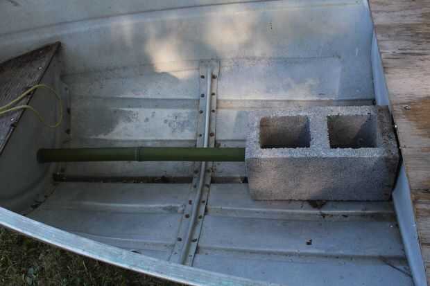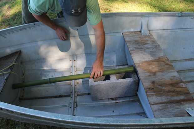 Poner los bloques en el barco y medir cuánto tiempo un pedazo de bambú o pedazo de madera tiene que ser para evitar deslizar hacia adelante. Cortar la varilla y jam entre los bloques y el borde de la embarcación. Luego poner la vela en los bloques de hormigón y jam una roca a su lado para evitar que se caiga. (ver imagen 4) Ahora con un ayudante sosteniendo la vela hasta tomar ambos extremos del blanco de la cuerda y atar firmemente a ambos lados de la vela por lo menos un pie hacia la parte trasera del barco (ver figura 5). Luego ata la cuerda amarilla firmemente a la parte delantera del barco. El mástil y la vela ahora debe estar centrada en el barco.