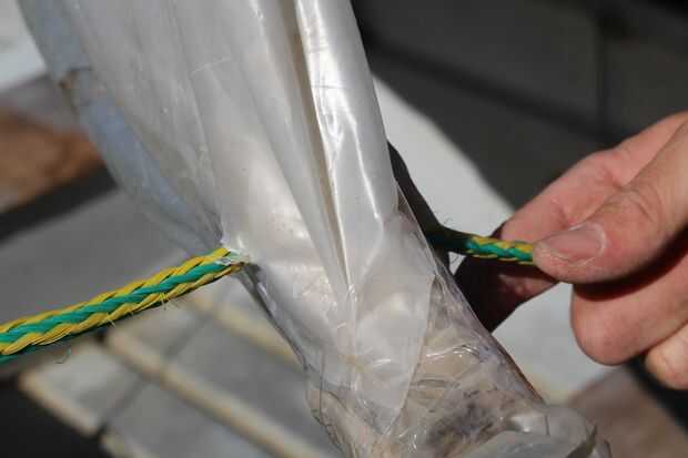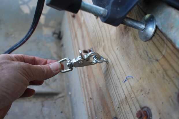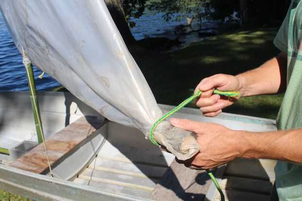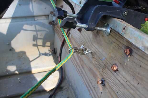 Para finalizar el velero, hágale un agujero a través de la vela de plástico en el extremo de la varilla horizontal y una cuerda a través de la alimentación. Voy a referirme a esta cuerda como la cuerda verde. Ata la cuerda verde en el extremo de la varilla horizontal. Entonces debajo del tornillo de motor trolling en el ojo gancho y montar un carabinero estilo pinza. Alimentar el cable verde a través del clip. Esta cuerda se utiliza para controlar cuánto lejos de o cerca del barco necesita la vela para coger el viento correctamente. Hicimos una quilla improvisada (una quilla ayuda a un velero ir directamente a través del agua en el lugar de desplazamiento a través del agua como el viento empuja) fuera de una tabla de madera y una pinza. Todo lo que necesita hacer es colocar la madera al lado del barco alrededor de la mitad con una abrazadera. Cuando vayas a iniciar navegación, asegúrese de que ajustar la quilla por lo que es en el agua.