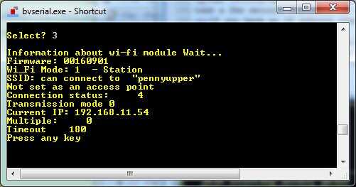 Cualquier problema en esta etapa será debido a los cables o a no ser capaz de conectarse a un punto de acceso existente. Si este último es el caso entonces no se verá una dirección IP. Compruebe que ha introducido el SSID y la contraseña correctamente, en caso de duda volver a hacerlo. Otra posibilidad es que usted puede estar fuera de rango, pero en la práctica tengo un ESP8266 funcionando muy bien que es de unos 20 m de la AP y a través de paredes de 2 ladrillo.