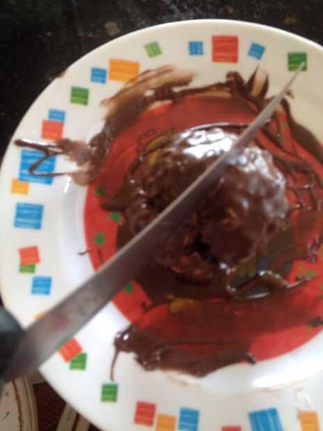 Cuchillo uso para cortar por la mitad. Hablar sobre las diferentes partes de la tierra si quiere. Caída de especia es el núcleo interno. Melcocha es el núcleo externo. Rice Krispy es la chimenea. Y la cubierta de chocolate es la corteza. La corteza es de 40 millas de profundidad.