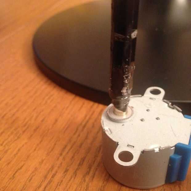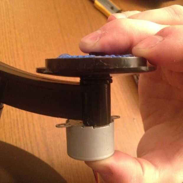- Inserte el eje + eje de configuración en el mundo, trayendo el motor flush con el brazo del mundo. Conecte la placa de base en el eje y mantener la configuración todo firmemente con una mano, por ejemplo presionar el motor hacia arriba con el pulgar y la rueda y su eje hacia abajo con los otros dedos.