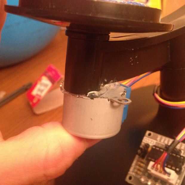 Inserte el eje en el mundo y la placa base sobre el eje del enchufe. Pegar el motor al eje del globo, unas gotas de epoxi deben hacerlo. No utiliza pegamento caliente puesto que el motor puede calentarse a veces y un pegamento sí mismo lejos.