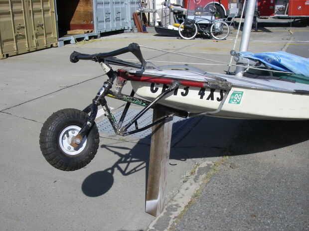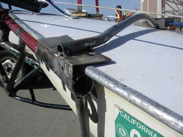 Parece bastante complicado, pero es sólo un montón de tubos soldados con autógena juntos. Yo primero soldó con autógena el soporte que agarra el borde del barco. Luego coloca la rueda delantera donde necesita estar. Entonces yo sólo seguí soldadura de tubos más hasta que el marco era todo los triángulos. Triángulos hacen un marco fuerte. Un rectángulo puede ser aplastado presionando en las esquinas. Pero no un triángulo. Es por ello que el marco de la bici consigue doblado en el frente donde es tipo rectangular. Las piezas triangulares de un marco de la bici casi nunca haz dobladas. Estudiar duro en clase de geometría para aprender el por qué esto es. ¡ Es útil!