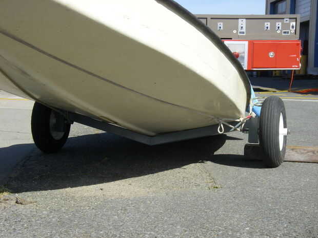 El eje trasero era fácil. Tuve un par de ruedas de la carretilla y encontró a un par de tornillos de gran tamaño adecuado para que encajen. Cortar algún ligero acero tubería de 2" y soldados en una especie de am' forma para que coincida con la uve de la parte inferior del barco. Perforar orificios en los extremos de los pernos del eje y había agregada las ruedas. Me Coloque las dos tuercas en los pernos del eje y los apretados uno contra otro para no salir. No apriete los pernos con el fin de no carga lateral los cojinetes demasiado.