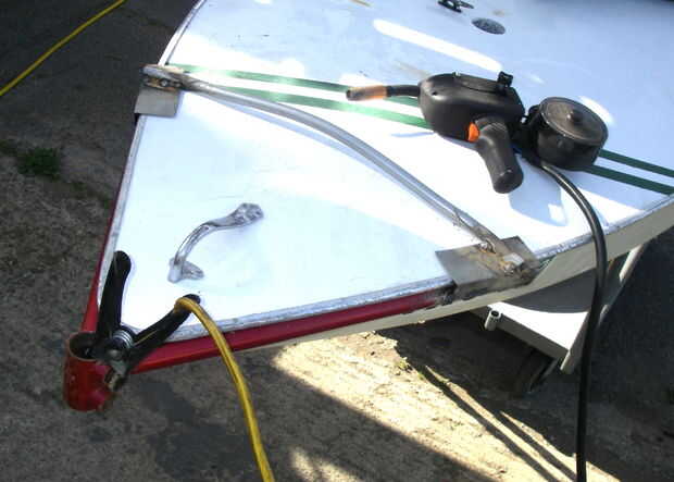 Usé mi spoolgun alimentado por el carrito de Golf Solar para hacer la soldadura. Corrí el spoolgun 18 voltios para las cosas finas y 24 voltios para el grueso de la materia. Usé. alambre base flujo del 030". Hice la soldadura de tachuela con el marco en el barco para conseguir el ajuste adecuado. Entonces sacó el marco para realizar las soldaduras para que no se queme el barco.