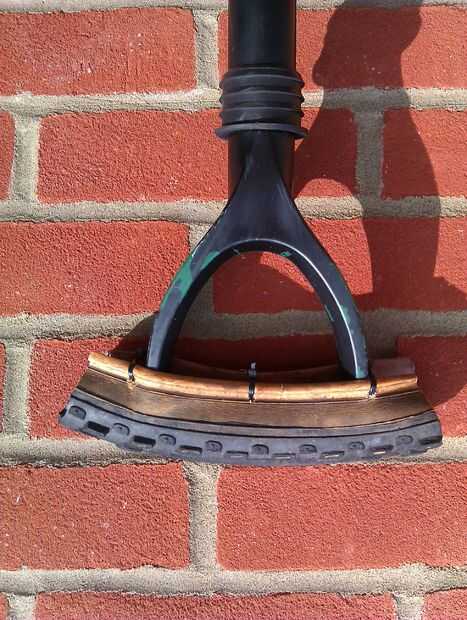 Tome su vieja bicicleta neumático y corta una sección de dos pulgadas más largos que el mango de la pala - hacer tres agujeros, uno en el centro y uno en cada extremo con una mano cosa puntiaguda.