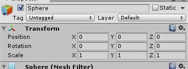 Ahora Compruebe la derecha de la pantalla y en el inspector, cambie los valores de posición de la esfera. Cambie de posición en X, eje Y y eje Z a 0.