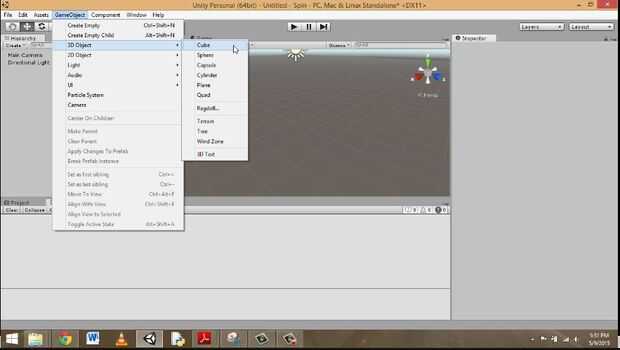 A continuación crearemos un GameObject. Todos los juegos de la unidad se componen de GameObjects, que es básicamente todo lo que puede controlar y es en la escena. Esto incluye todas las formas, las cámaras y luces. Ir al menú de la izquierda donde GameObjects todos aparecen y eliminar luz direccional.