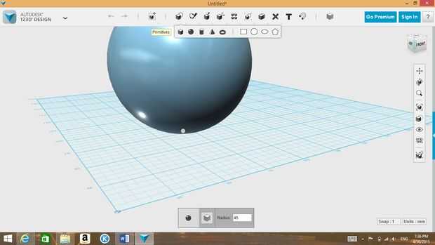 a) después de abrir el 123D diseño, ir a la barra de herramientas en la parte superior de la programa. Utilice la herramienta de "Esfera" para crear una esfera, ("Esfera" es icono de "Primitivos").