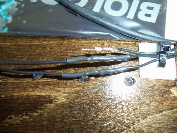 6) corte un trozo de cable que va desde el extremo de cada resistencia a cerca de 8 pulgadas más allá de la nariz de tu longboard. Tira de ambos extremos, ejecute a través de los lazos del cierre relámpago y uno de ellos a la resistencia de la soldadura. Estar determinados a poner un pedazo de calor retráctil sobre el empalme de soldadura y LED para asegurarse de que no encienda ningún LED excepto el que quieras. En caso de duda, cortar los cables extra long...it es mucho más fácil para clip hacia abajo y luego tratar de hacerlos más largos con empalmes.