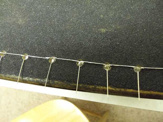 2) soldar el extremo pelado de cada LED. Utilizar una tercera mano si es inestable o unas pinzas si no está lo suficientemente rápido como para no quemarse por el alambre caliente.