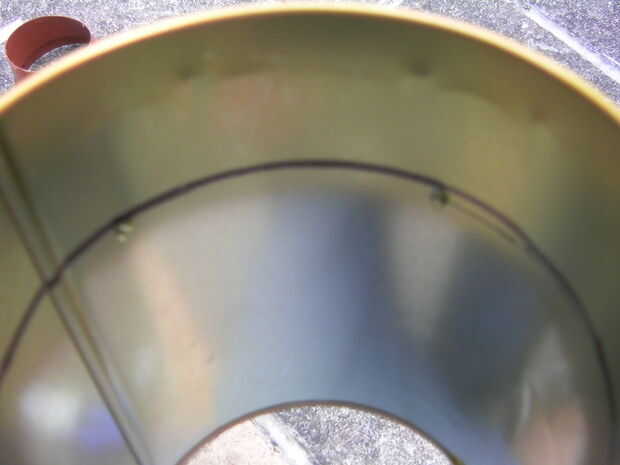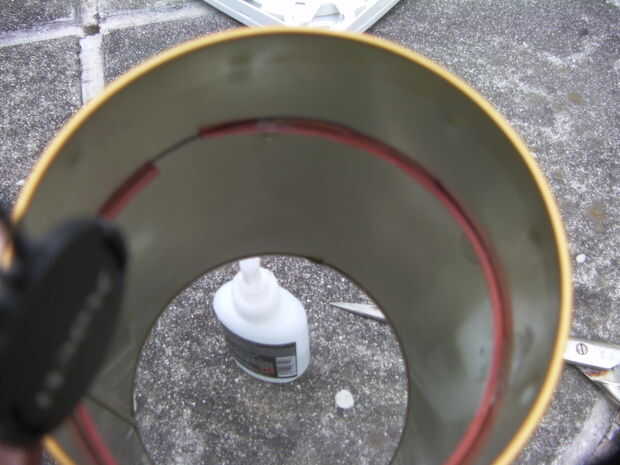 Coloqué cuatro gotas de pegamento en la línea de la pipa/lata y pegado la llanta cortó el bote a la línea para formar un tope dejando un hueco de la bisagra pasar y deja para secar.