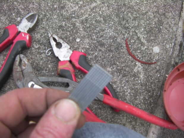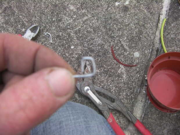 Doblar un clavo perno galvanizado para formar un lazo o cuadrados como mina salió, dejando una cola para pegar a la olla, esto formará la bisagra.