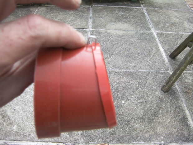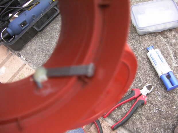 Colocar el colgajo en su posición taladré un agujero en la parte superior de la tapa y la olla 2mm del borde de la aleta de la bandeja, luego colocar la bisagra de alambre por el orificio y con tachuelas en el lugar con el pegamento en el interior de la olla, cuando esté seco aplicado dos parte apoxy pegamento para fijar permanentemente en lugar.