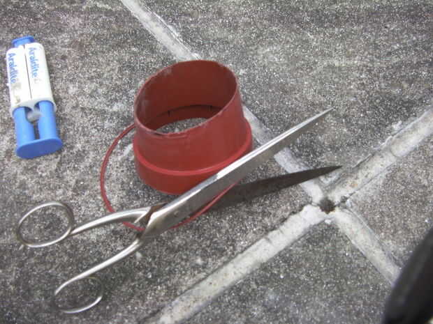 Introduciendo el bote en la lata o pipa recorte o embalaje puede ser necesario. Tuve que cortar el borde con unas tijeras para conseguir que montar pero podría utilizar la cinta del paño envuelta alrededor de unas cuantas veces para hacer la olla más ancha para tubos más grandes o espuma rígida cortar un anillo para cerrar la brecha existente tubos in situ. Tal vez de proyecto siguiente.