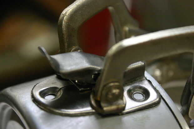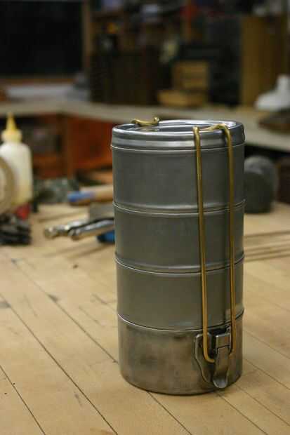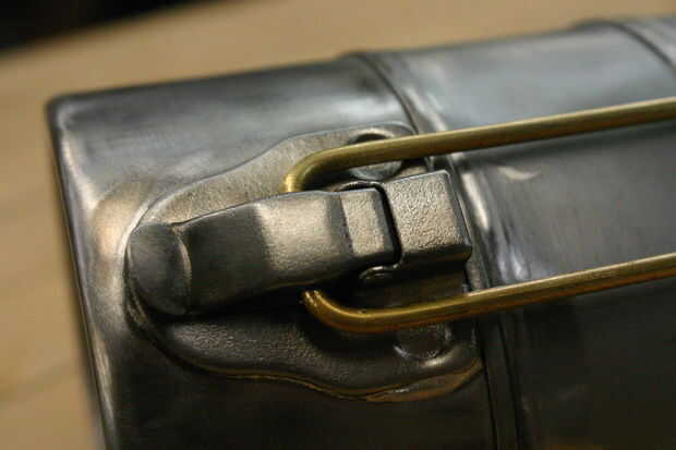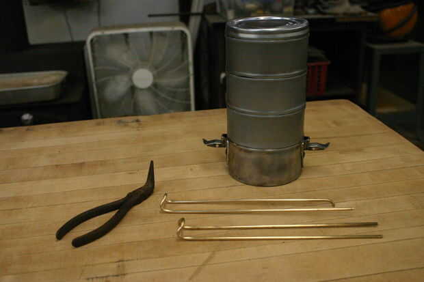 Con dos empates en su lugar, tenemos que las capturas de la moda. Usé varilla de soldadura para los míos. Tome un pedazo largo y doblarlo por la mitad (ambas mitades deben estar más altos que la caja de tiffin). Utilizando pinzas, doble la tapa encima para formar el gancho. En el otro lado, forma una curva cerrada hacia el interior de cada varilla. Usé la mordaza para ayudar con esto. Una vez que se forman de las barras de soldadura, ajuste hacia arriba y gancho en los sorteos.