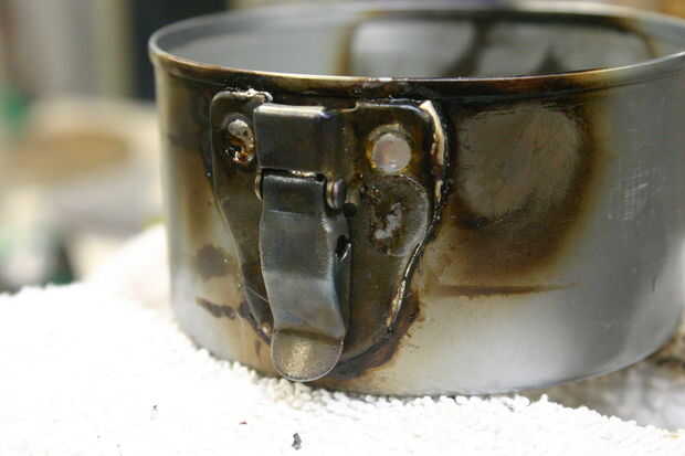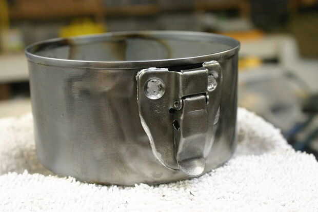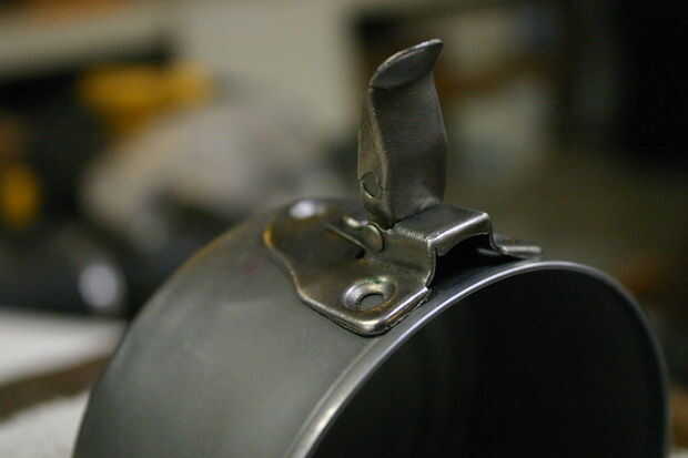 Para los sorteos de la soldadura, primero la forma para seguir la curva de la can. Martilló el sorteo en una madera dowell para obtener la forma áspera. Una vez el sorteo encajan bien, limpiar ambas superficies y aplicar fundente. Celebró junto con mordazas de tornillo de banco y utiliza una antorcha para calentar a las temperaturas de soldaduras. El interior del atún puede tiene una capa protectora que se quemará si se calienta demasiado. Cuando hayas acabado lo hará probablemente mirar feo, pero tener fe en el poder de ruedas de alambre y papel de lija!