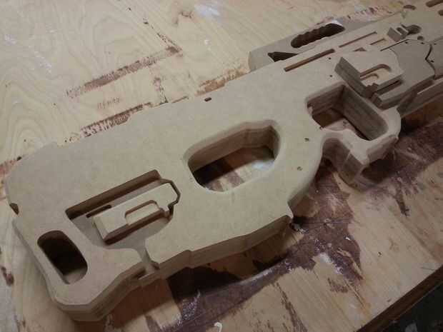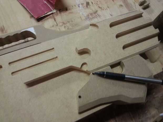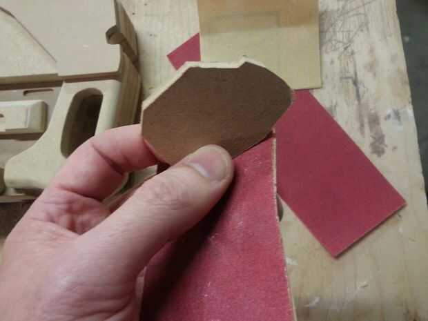 Ahora que la forma del modelo está empezando a venir juntos, es hora de recortar todos los 1/2" detalle de piezas que van a lo largo de la parte delantera. Bisele los bordes como se muestra en el router. Otra vez, experimente con un pedazo de chatarra para obtener la profundidad correcta. Lije con cuidado todo con papel de lija de grano 150. Lije todo el cuerpo, las piezas de detalle, los dedos. Todo. Para ello un montón. Cuanto más tiempo que pasas alisar hacia fuera los pedazos ahora, menos tiempo que pasarás tratando de entrar en espacios y pequeñas grietas.