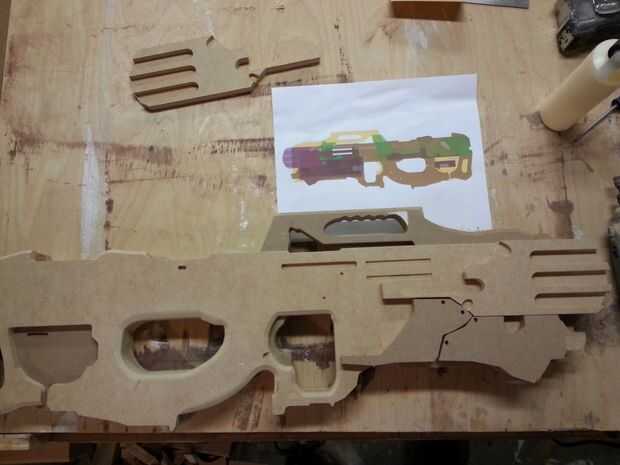 Empezar por hacer referencia a la empuñadura a lo largo de la parte inferior del modelo. Aplique pegamento en la parte posterior entera y fijarlo con la abrazadera en su lugar o colocar algo pesado sobre ella. Asegúrese de que no cambio! Una vez que esté seco, alinee el disipador de calor hace referencia al borde como se muestra. Es una buena idea de seco-montar todas las piezas en este punto para obtener una buena idea de cómo van juntos. Luego, pegar abajo uno por uno.
