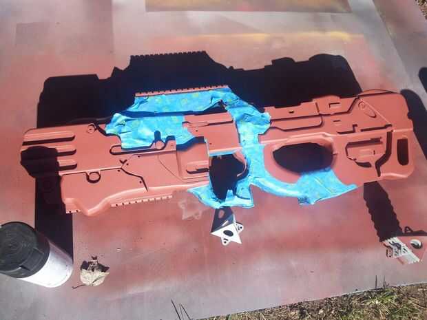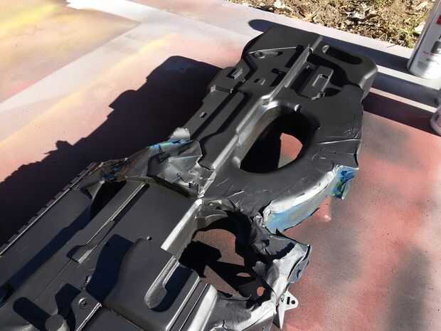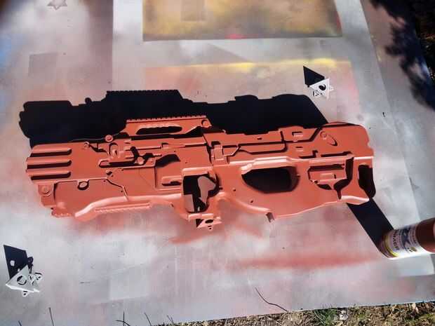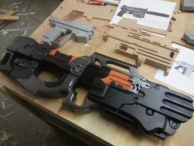 Les recomiendo poner abajo una capa de plata seguida de naranja (para el detalle) y luego plano negro. No te preocupes al final, siempre puede Agregar una capa de clara en cualquier acabado que desee (por ejemplo, mate, satinado, brillante). Te recomiendo el ebook de Harrison Krix en pintura y envejecimiento: pintura y erosión para accesorios y réplicas también, asegúrese de tirar algunos tornillos real — esto ayuda a vender el efecto. He encontrado algunas hebillas frescas en Home Depot que mientras que no coinciden con el diseño exacto, hizo el modelo look más completas. Al final, asegúrese de que tener diversión con ella! Use su imaginación!