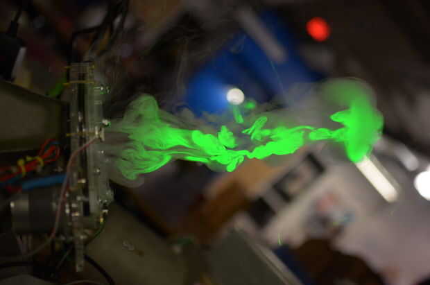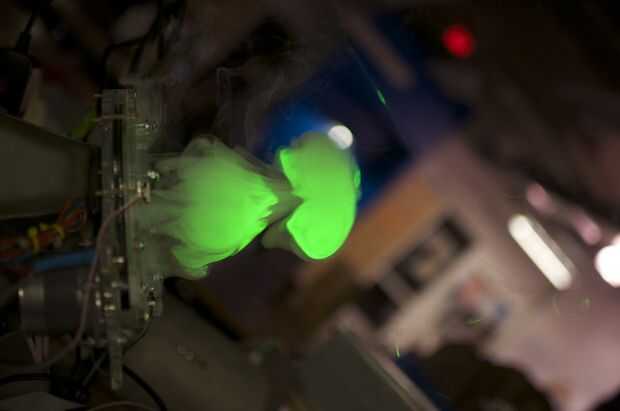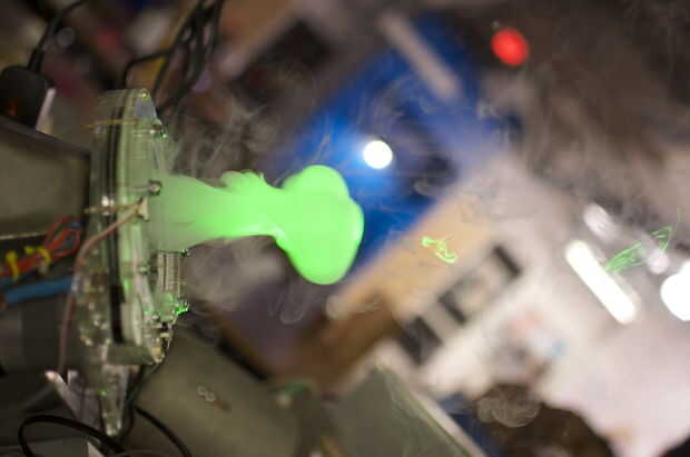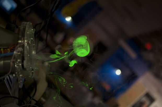 2) hacer un cañón vórtice de ella como hizo-derribar algunos drones voladores con anillos de humo, impress niños y novias, láser brillo a través del humo.