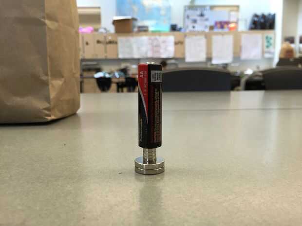 Representado tiene dos diversos tamaños del mismo imán, que no importa. Jugar alrededor con la relación de los imanes (si no todos el mismo tamaño), a todo el trabajo al final. Pegan a los imanes y luego adjuntarlos al extremo negativo de la batería.