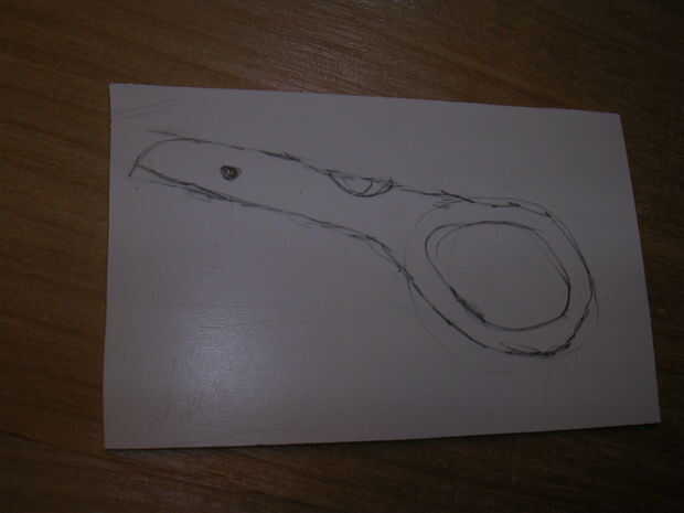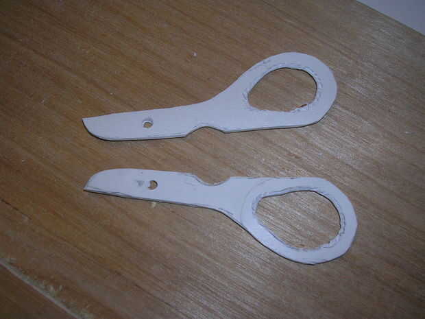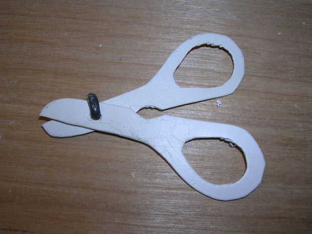 empecé con un prototipo. Que bosquejar lo que quería en un pedazo de plástico, comparando el bosquejo a un pequeño par de tijeras de costura de mi esposa. Una vez que llegué algo pensé que trabajaría, corte de plástico con algunos... tijeras - no tijeras de costura de mi esposa sin embargo. Luego trazó alrededor de él y cortar otro. I los apilados, había perforado el agujero del pivote y poner un trozo de alambre de cobre a través de.
