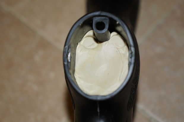 Quite la culata del rifle. a continuación, retire la almohadilla de retroceso con un destornillador. poner una gota de jabón en el destornillador lo ayudará a ir a través de los orificios de la almohadilla fácilmente. mi tikka tenía una rejilla plástica insertar detrás de la tecla de retroceso, pero no sé si tikkas mayores tienen esto. quitar por ahora hará verter la espuma mucho más fácil. a continuación, quite la tapa de la empuñadura. Esto parecía ser el lugar más fácil para embalar el mango con masilla de plomería. debe poner algo en esta zona de la culata para evitar que la espuma de expansión a través de él y en el área de acción. Me lleno la plomería masilla plana con el mango de una cuchara de madera.
