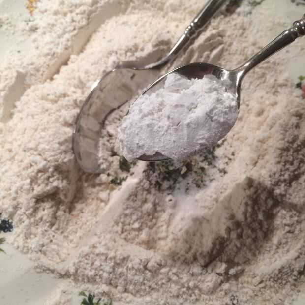 3. Agregue polvo para hornear a la mezcla de la flor. Poner una cucharada colmada de, pero usted tendrá menos o tus pasteles es muy muy preciosos.