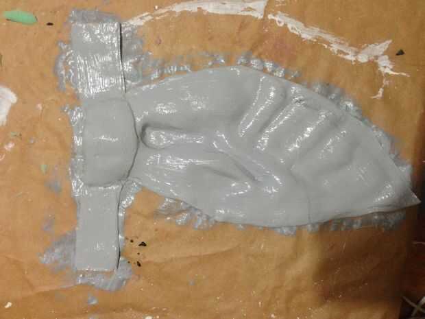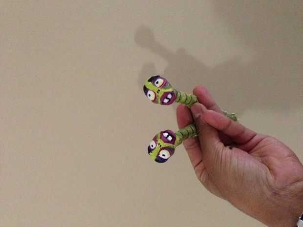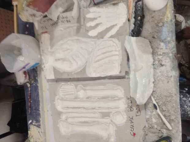 Gusano, lazo y huesos: el gusano, corbata, costillas, huesos del brazo, cuello huesos y huesos de la pierna fueron esculpidos en arcilla media Chavant NSP y moldeados con yeso para hacer castings de látex. Las piezas de caucho crudo fueron retocadas y cubiertas en brillo en la pintura oscura.