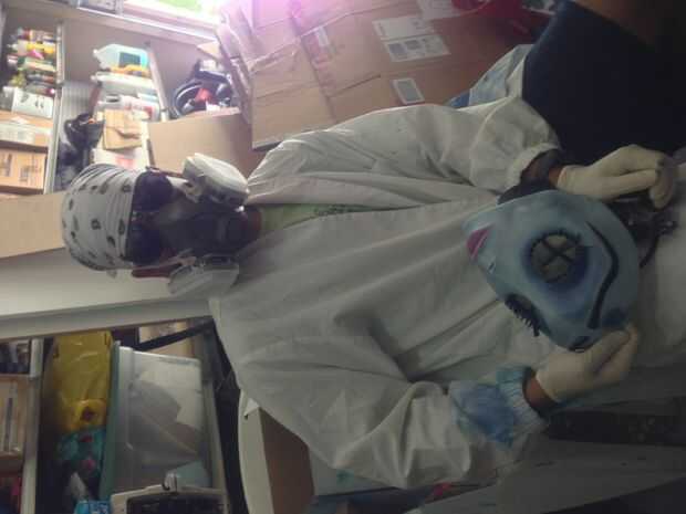 Ojo agujeros fueron cortados y reemplazados por tejido Buckram. Ambas máscaras eran entonces detalles de aerógrafo y menores añadidos.