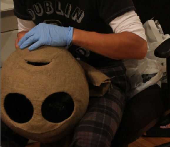 -Una vez que todo haya secado, la tela de arpillera y cubrir toda la cabeza con la pistola de pegamento para fijar el material a la base de la cabeza.