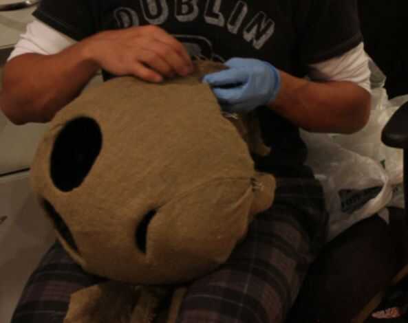 -Ser consciente donde continúe pedazos de material. La tela extiende un lil pero necesitarás cortarlo, para que quede la cabeza apretada, sin dobleces ni lagunas.