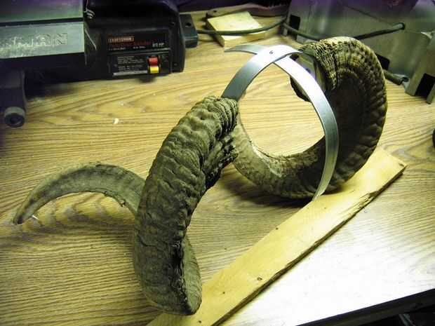 Continuación te quiere poner los cuernos al Castillete - utilicé dos tornillos por cuerno. Probablemente desee ajustar el ángulo de los cuernos para conseguir el aspecto adecuado, así que empieza con sólo un tornillo (lo suficiente para sostener el cuerno en el marco) y entonces ajustar el ángulo mientras se mira en el espejo. Marca donde el marco es de madera, luego volver y el segundo tornillo manteniendo el marco dentro de sus marcas. Una vez más debe chaflán (bisel) los agujeros en el marco con un tamaño mayor broca de la herramienta que chaflana para que las cabezas de los tornillos queden al ras con el marco.
