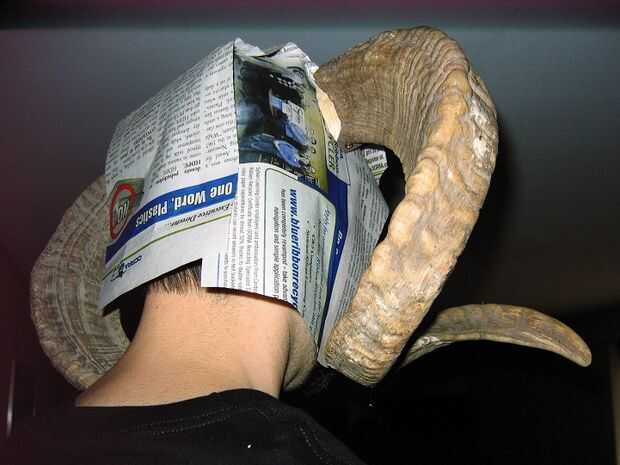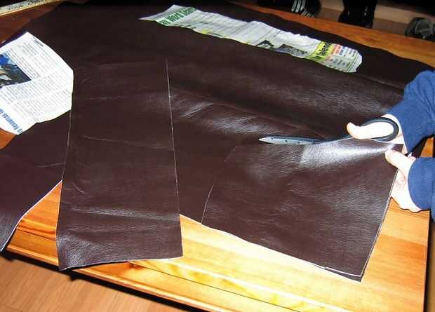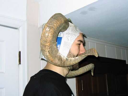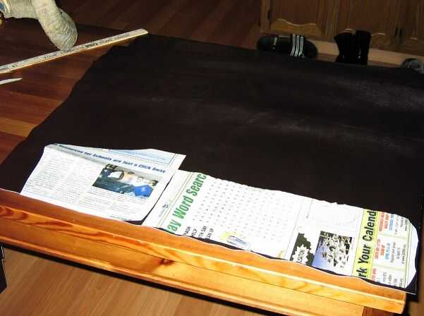 Una vez más, esta parte puede requerir algún ensayo y error utilizando trozos de tela periódico o chatarra para conseguir algo que se ajuste a su cabeza (ver imágenes abajo donde hice una maqueta del periódico de la parte de cuero). En lugar de intentar solucionar los cuernos, me decidí a coser el sombrero todo y luego atornillar a través de la piel en los cuernos. Dependiendo de cómo limpia sus cuernos salieron, puede que necesite tratar de pegar en algún material de cuero alrededor de los cuernos para cubrir encima de la madera o relleno de huecos de aire.