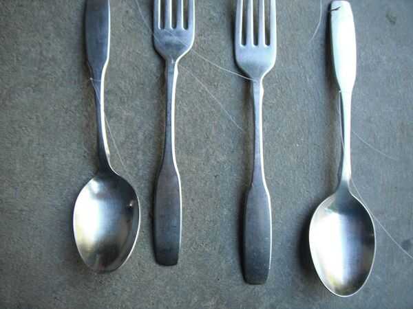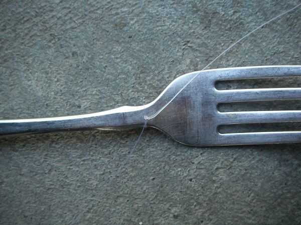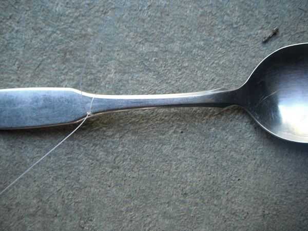 Las cucharas se ató lo más alta posible en el mango, (si no hay bastante grande en la parte superior, tendrás que perforar un agujero).
