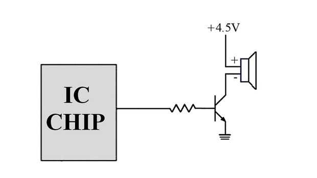 A continuación es necesario comprobar cómo el altavoz está conectado con el resto del circuito. En la mayoría de los casos el terminal positivo del altavoz se conectará a la tensión de alimentación positiva de la fuente de alimentación. El terminal negativo del altavoz se conectará con el colector de un transistor NPN. El emisor del transistor se conectará al borne negativo de la fuente de alimentación. La base del transistor se conectarán a los chip del procesador. Puede haber una resistencia entre ellos. Para reproducir el tono, el chip envía una serie de pulsos para el transistor. El transistor entonces rápidamente conecta y desconecta el terminal negativo del altavoz al terminal negativo de la fuente de alimentación. Esto hace que el altavoz para reproducir un tono.