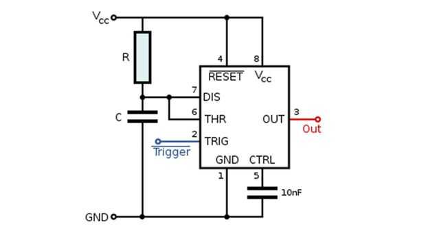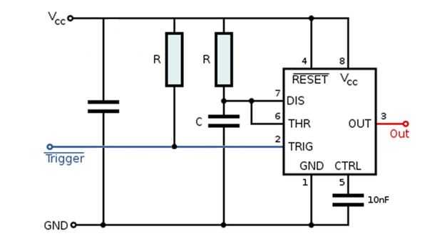 El circuito de control es un circuito básico del 555 temporizador. Esta configuración se llama "monoestable". VCC y GND para este circuito se conectan directamente a los terminales positivo y negativo de la fuente de alimentación de la puerta. Pin 2 (el pin de disparo) está conectado al cable libre del segundo interruptor. Cuando el timbre se activa, pin 2 está conectado a tierra a través del transistor de salida. Esto provoca la salida en el pin 3 se encenderá durante un tiempo que está determinado por los valores del condensador y la resistencia. Puede determinar este tiempo mediante la fórmula: