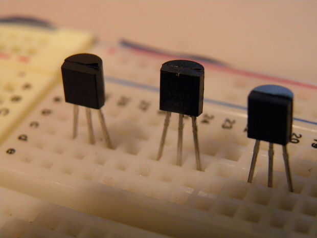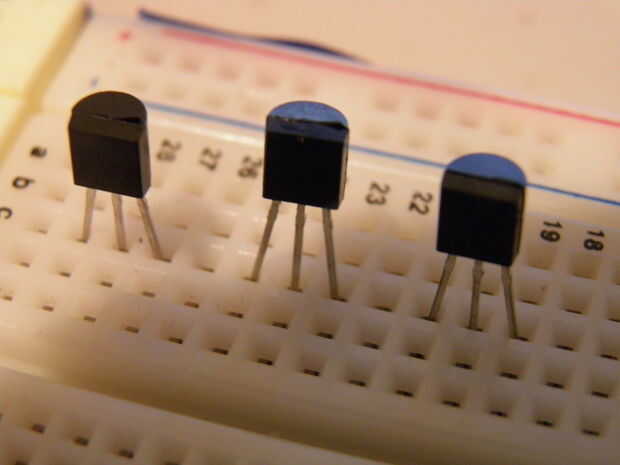 Posiblemente el elemento más crucial de este proyecto es trazar los transistores correctamente. Los transistores permiten una conexión a tierra para hacer uso de voltaje positivo. Empezar a separarse un poco las patas de los transistores, asegurándose de que encajan en sus respectivos agujeros (como se muestra en fotos). Asegúrese de que hay en l este vacío fila entre los transistores. Doble Compruebe para asegurarse de que el lado plano quede frente a usted, de lo contrario no funcionará. Hacer esto para todos 7 transistores. Pone un uno extra si haces el apoyo de AM/PM