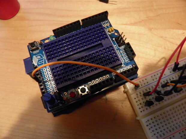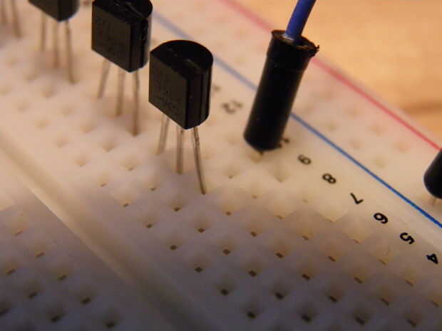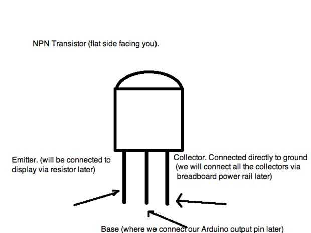 Lección básica del transistor. Para utilizar un NPN transistor, colocación de corriente en el pin de la base permite proporcional corriente por el pin del colector para el pin emisor. Muy básico, como transistores tienen diversas corrientes mínimas, grados máximos y diferentes capacidades actuales, junto con muchas otras cosas. Por suerte, un 2N3904 es muy amable con nosotros y perfecto para pequeña escala, alta frecuencia de conmutación con una fuente de energía baja, como un Arduino. ¡ Yay!