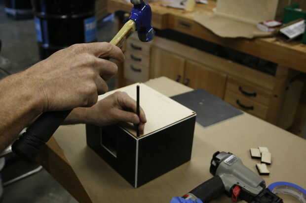 Con una guía que recorte de madera de 1/8", usé un puñetazo de transferencia averiguar dónde perforar el imán de la armadura.