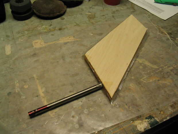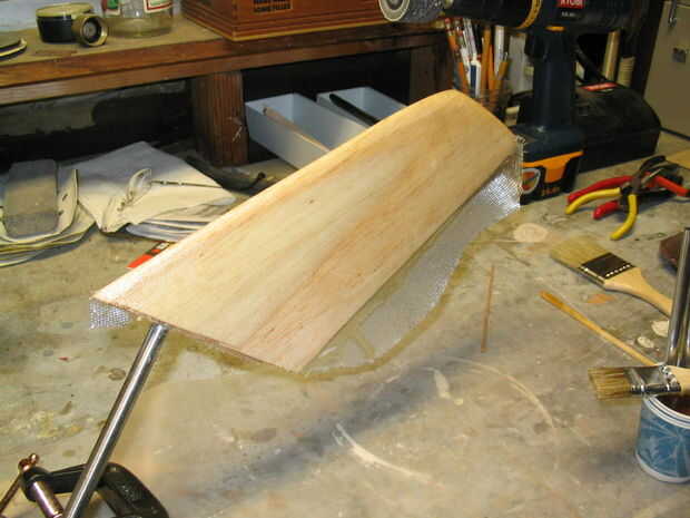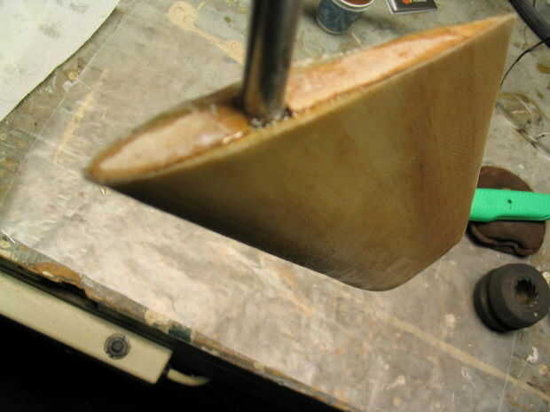Después se forma el espacio en blanco, tela de fibra de vidrio de 4 oz más se ajustaron al exterior. Esto realmente endurece para arriba y proporciona un duro caparazón exterior a la base de la balsa. Después cura el vidrio, se agregan capas más de epoxi para llenar el tejido de la Copa y dar grosor a la arena a la forma final. Se añadieron capas de relleno de dos y cuando eran hardedned, lijar las capas hasta la superficie final. Demasiado lijado y a exponer la tela de fibra de vidrio, muy poco y la superficie no será justa. Tras el lijado final, el timón está preparado para un funcionamiento de ensayo en el barco.