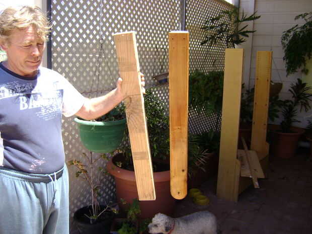 Usé algunos izquierda sobre madera de pino. Una longitud de 900 m m era adecuada para mi altura manejar la cabeza cómodamente cuando se haya completado. Así, 900x90x50mm. Un extremo redondeado. Usé una sierra caladora eléctrica y áspero en forma de final. Acabar con eso escofina para un buen extremo superior redondeado. Ellos utilizan un router para hacer un borde razonable. Perfore un agujero a través del extremo para el axil para el timón. Usé un 80x9mm tornillo y tuerca. Arandelas también. Utilice el mismo barniz como antes. Suspender la madera de algo por lo que puede barniz de una sola vez. (levitación?)