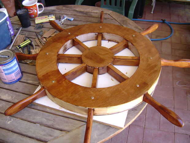 Mientras que el barniz para el montaje del timón se está secando, ajuste el anillo exterior quedado al timón. Fijado en posición con los tornillos gabinete tienen un ala ancha agradable en ellos y son muy decorativos.
