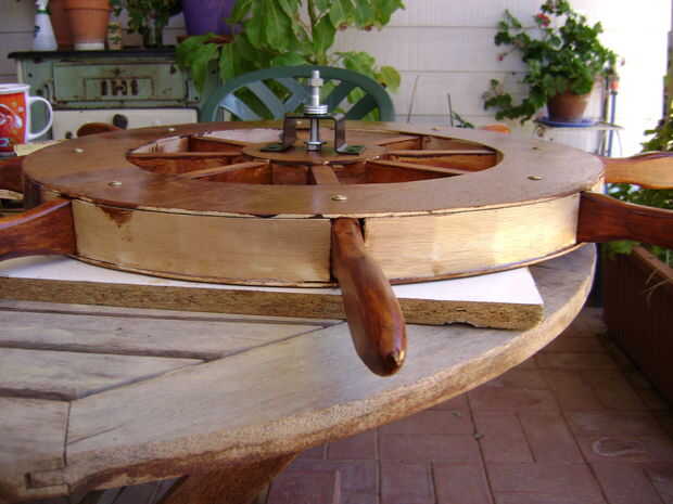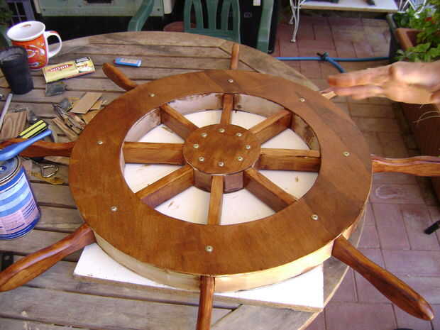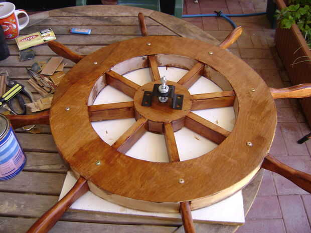 Obtener un soporte de montaje o placa como se muestra. Ésta debía ser utilizado para el montaje de una sombra vela a la casa. Pero, no importa. El viento puede destruir estas velas. Éste se adapta maravillosamente al centro del eje del timón. Es una buena idea para colocar el tornillo en él primero!!!!!! La cubierta del eje se fija sólo los radios con gabinete clavos. El soporte del eje se fija con tornillos gabinete a los rayos.