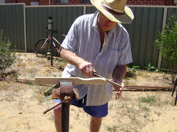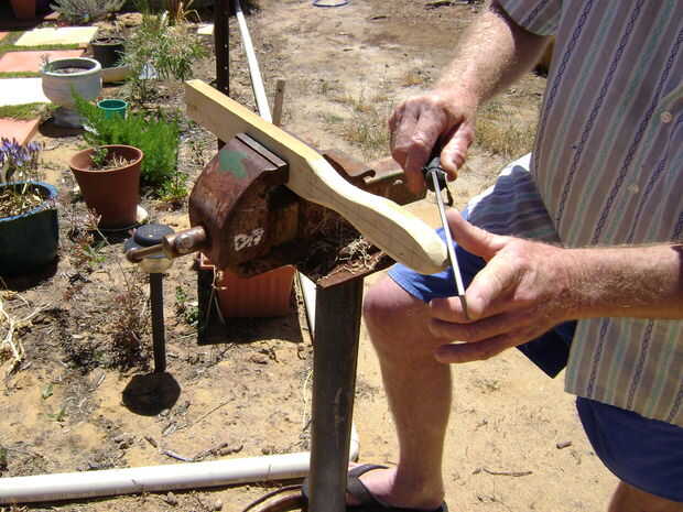 Aquí utilicé mi escuadra de combinación. Bien, la regla de parte de todos modos. Retrospectiva, dice hacer una plantilla del perfil que desea. Cuando ha definido esas directrices en lápiz, colocar el "proto habló" en un vicio y presentación. Usé un nuevo archivo de escofina capaz de eliminar metales como que funciona muy bien en pino. Olvide limpiar el raspador. Buena idea usar guantes como Limas gruesas son buenos para eliminar la piel.