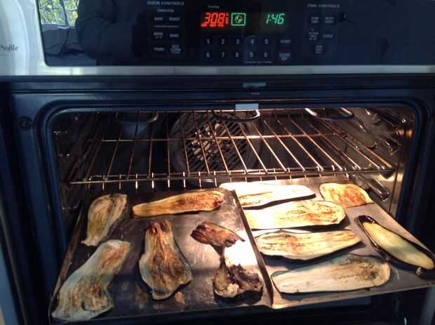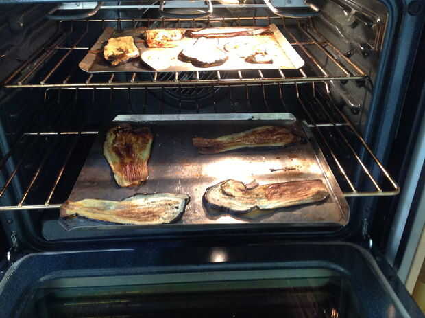 Después de rebanar las berenjenas verticalmente, cepillo con aceite de oliva, sal y les pimienta Coloque en una bandeja para hornear galletas. Un truco para conseguir las berenjenas para mantener su forma, es cortarlas en rodajas y colocarlos en un colador que medie con la sal kosher durante unas dos horas antes de hornear o asar a la parrilla les. (Como se puede ver, yo no hice este paso)