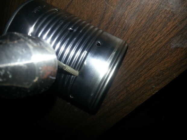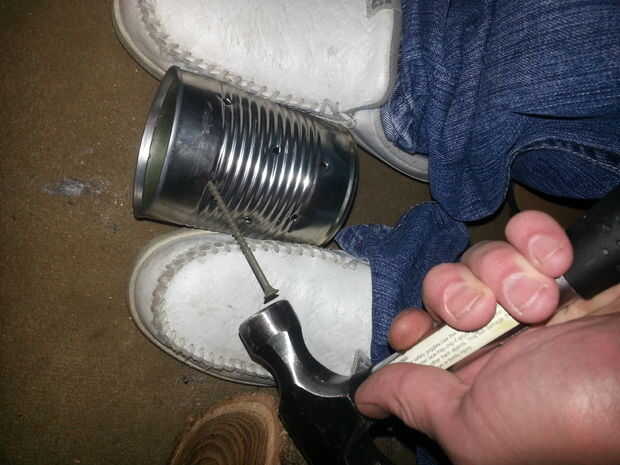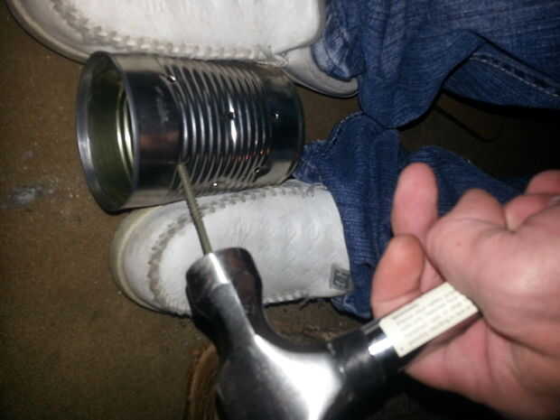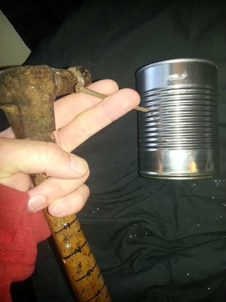 Bajar el martillo y un clavo de tamaño bastante grande. Comience clavando los agujeros en el lado de la lata. Extendió los orificios alrededor de una pulgada aparte alrededor del el puede comenzar alrededor de una pulgada de la parte inferior de la lata. Hice tres filas de agujeros. Llevó a cabo la lata con mis pies y me clavó los agujeros. Asegúrese de que cuando los orificios hacia la parte superior para clavar no doblar la lata. Usando un clavo más ayuda cuando los agujeros. Si desea puede hacer un patrón en lugar de hacer los agujeros al azar. La ayuda de agujeros la luz venga lanzó. Esto puede dejar bordes afilados en el interior de la can. Si lo desea usted puede limar los filos. Yo no que he encontrado que no afecta a nada. Sólo asegúrate de cuando añadir vela no escarpe a ti mismo.