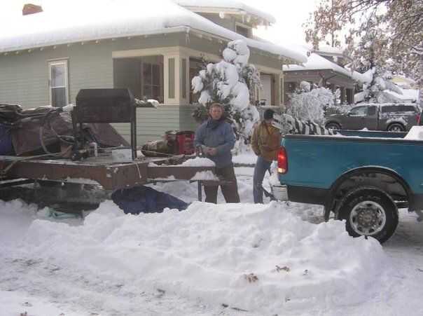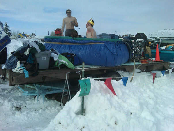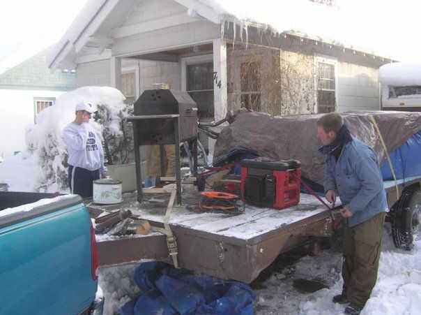 El tanque es un tanque stock de ganado. Teníamos tal vez 750 galones en él. No llenarlo más o bien desbordará por todas partes cuando la gente se en ella. Tuvimos que trinquete correa hacia abajo con un montón de correas. Y para evitar a tanto chapotear durante transporte correa unas tablas en la parte delantera y trasera.